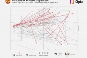 据Opta统计,曼联本场比赛传球294次,其中有75次长传,占比25.5%、2017年12月3-1击败阿森纳(占比27.9%)之后,这是曼联在英超长传占比最高的比赛。